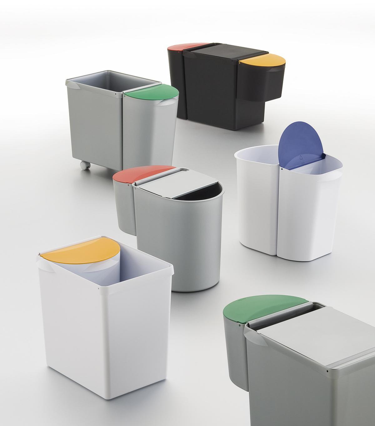 Constitué de 2 corbeilles à papier principales 18 et 26 litres sur lesquelles s’accrochent en option 2 bacs à déchets 5 et 9 litres, il s’adapte aux spécificités du tri sélectif dans chaque entreprise. Les corbeilles à papier reçoivent en option des couvercles métalliques, les bacs des couvercles en ABS dans 8 couleurs différentes pour l’identification de la nature des déchets. La dimension écologique de ce système est renforcée par l’introduction d’une filière d’approvisionnement en polypropylène 100 % issu du recyclage pour la finition Noir. Les finitions Aluminium et Blanc sont réalisées en polypropylène standard. Design Studio Manade